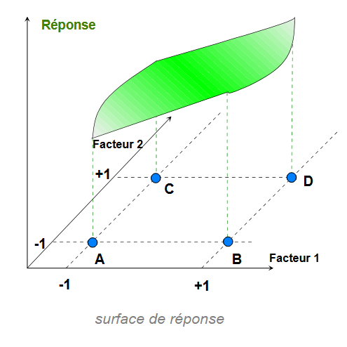 Les plans d'expériences permettent d'organiser au mieux les essais qui accompagnent des études industrielles. Ils sont applicables à de nombreuses disciplines et à toutes les industries dès lors que l’on recherche le lien (surface de réponse - cf. schéma) qui existe entre une grandeur d’intérêt (température, concentration…) et des variables (puissance, rendement…).